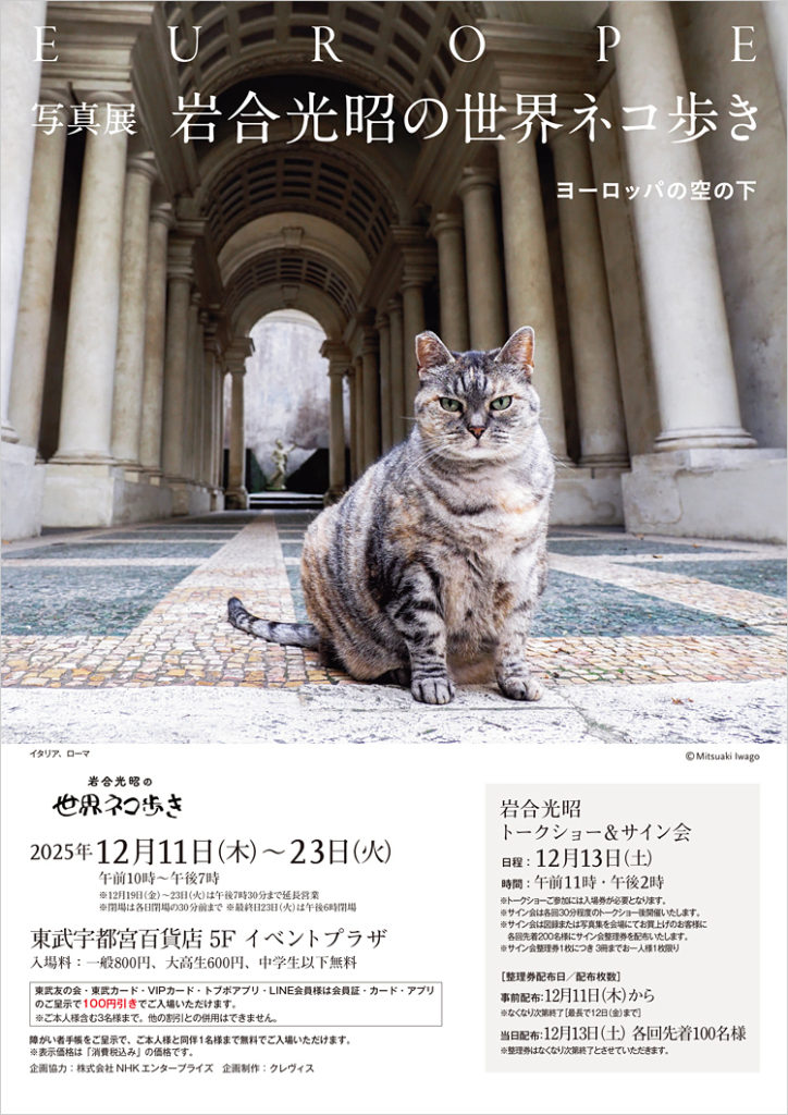 写真展「岩合光昭の世界ネコ歩き ヨーロッパの空の下」が栃木県宇都宮市にある東武宇都宮百貨店にて開催中!!同店として岩合光昭写真展は4年ぶりの開催となります。