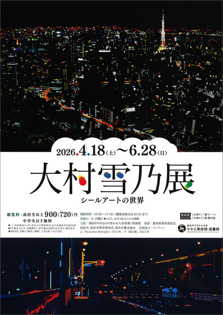 「大村雪乃展 シールアートの世界」が高浜市やきものの里かわら美術館・図書館で好評開催中! 人気テレビ番組「プレバト!!」に丸シールアートの先生として出演する大村雪乃氏は、文房具の丸シールで都市夜景の光を点描する注目の若手現代美術家です。
